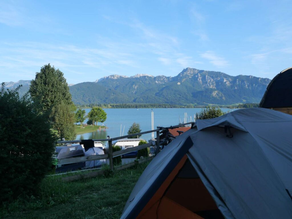 Unsere erste Station entlang der Via Claudia ist kurz vor Füssen am Foggernsee mit einem etwas engen Zeltplatz, aber mit Blick auf Neuschwanstein und der Möglichkeit im Foggernsee zu baden, ein sehr erfrischendes Erlebnis mit grandiosem Panorama.