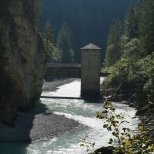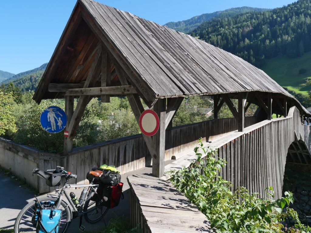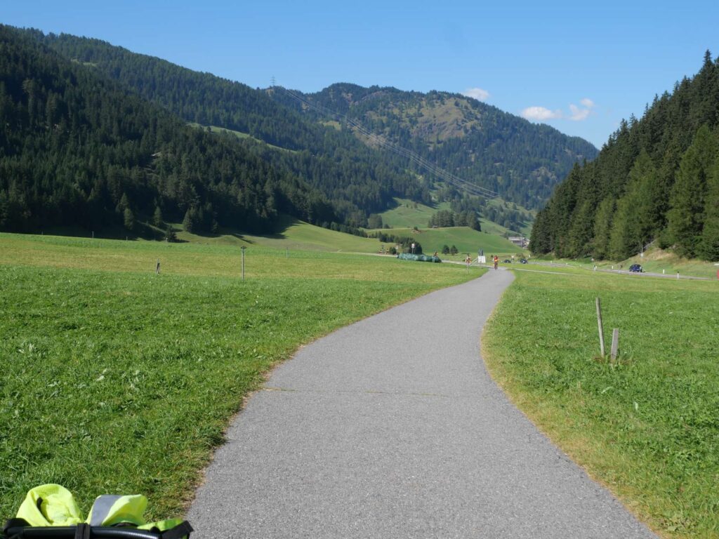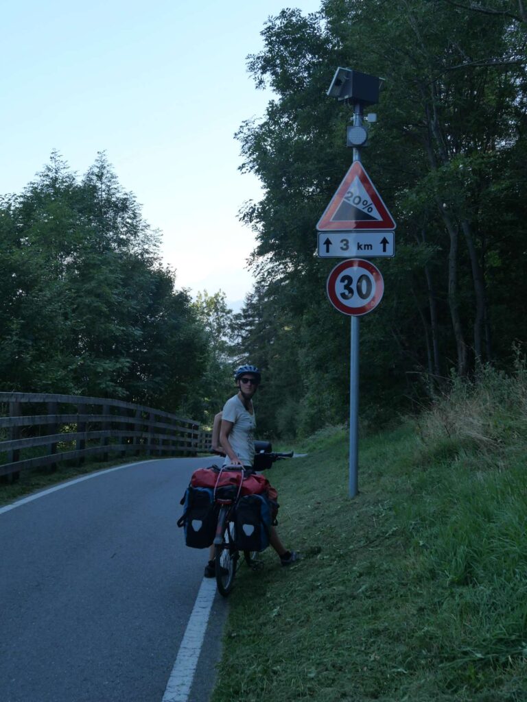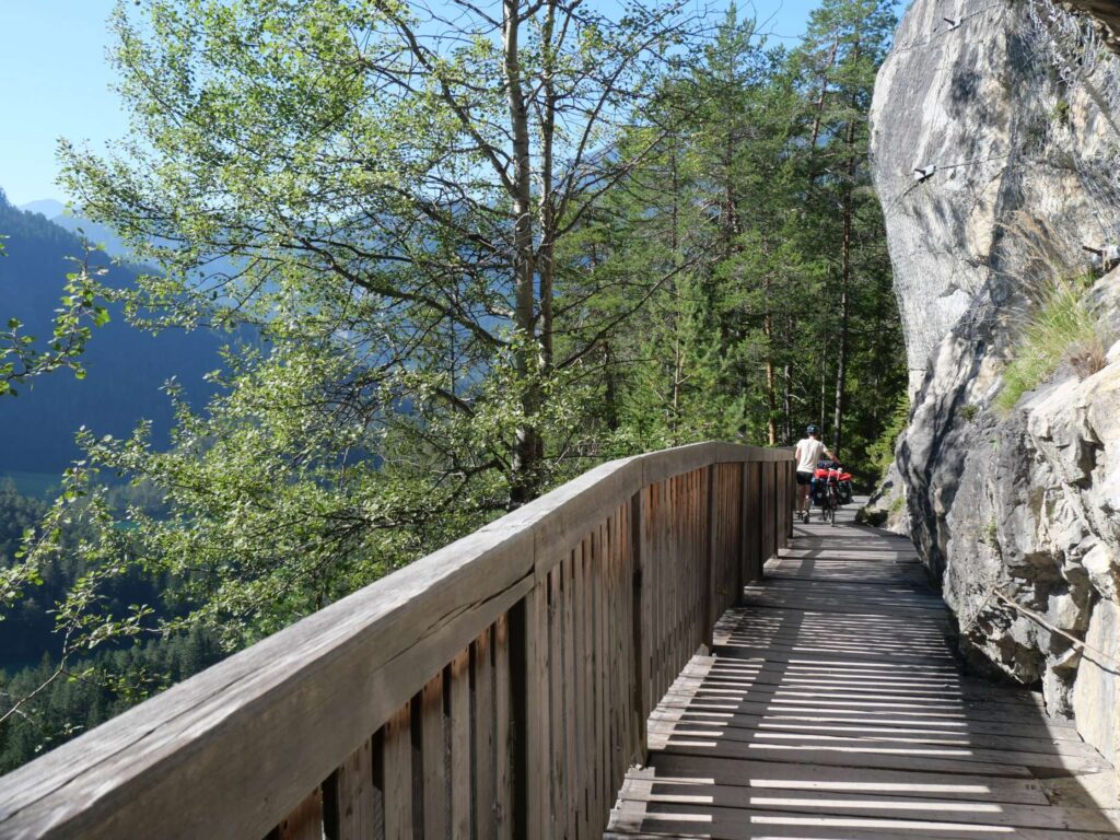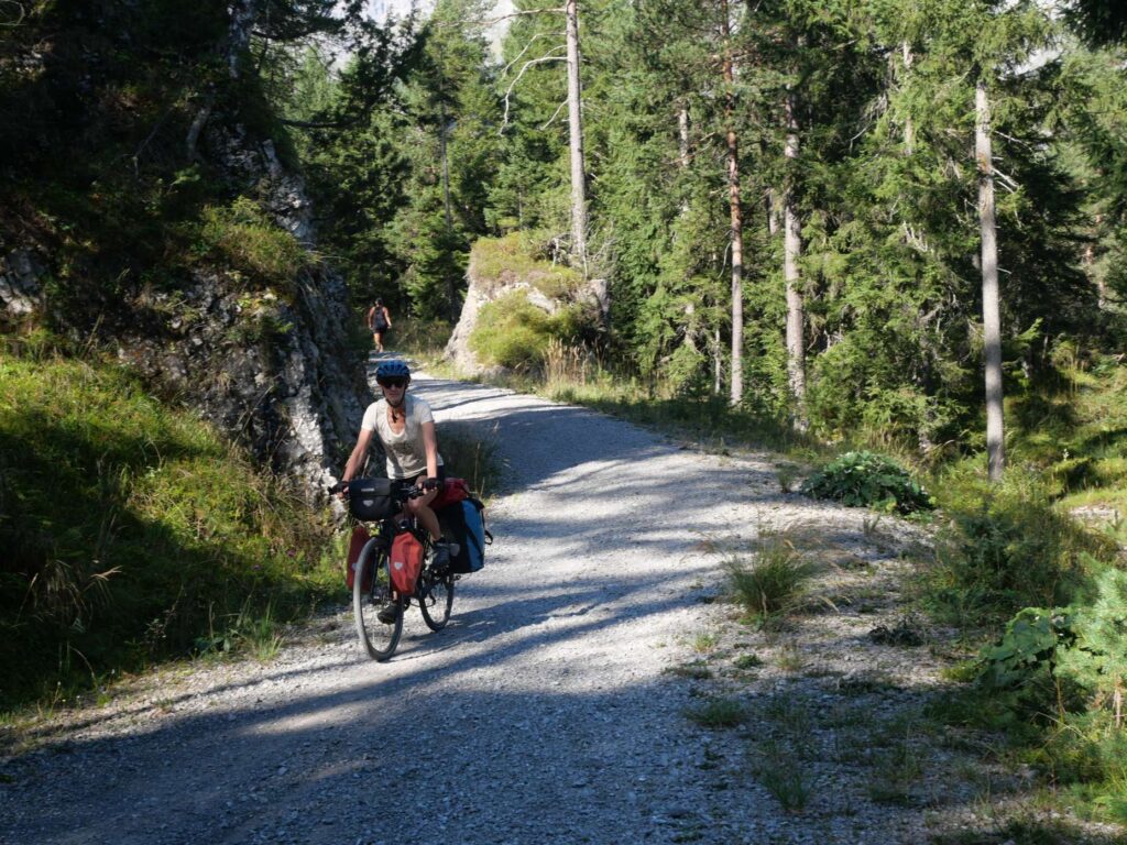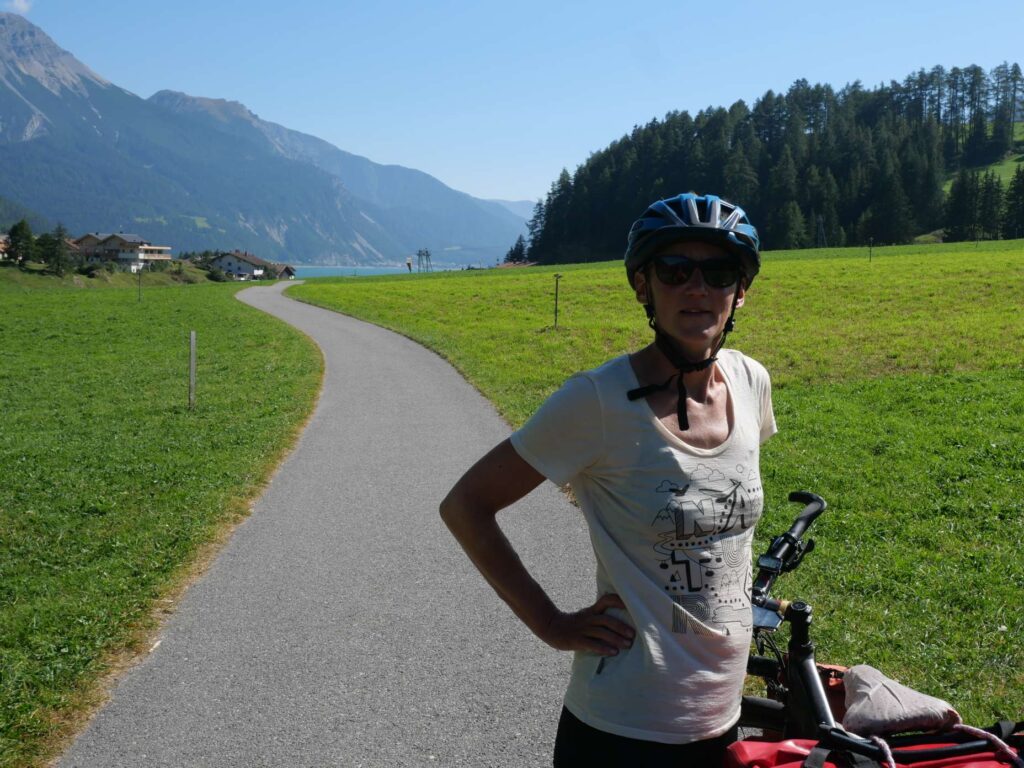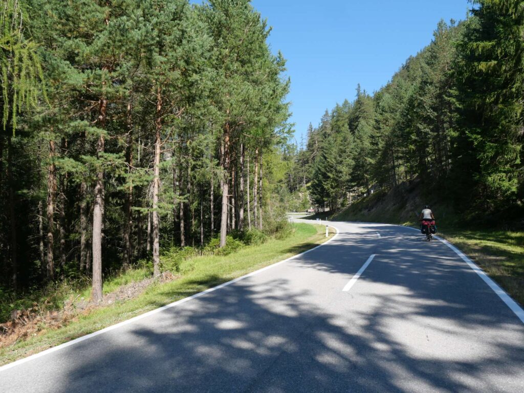 Am folgenden Tag liegt der Reschenpass auf unserem Weg, der höchste Pass (1515m) bei unserer Querung. Bevor wir die elf Serpentinen angehen kamen wir kurz durch die Schweiz. Die Serpentinen ließen sich ganz gut meistern, geduldig kurbelten wir in niedrigem Gang bergauf, machten auch eine Pause, um danach gestärkt weiter zu fahren und andere Fahrradfahrende mit deutlich weniger Gepäck auch mal zu überholen.