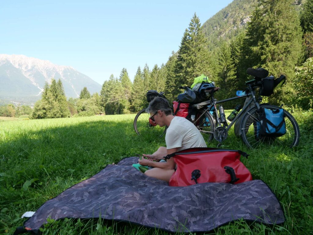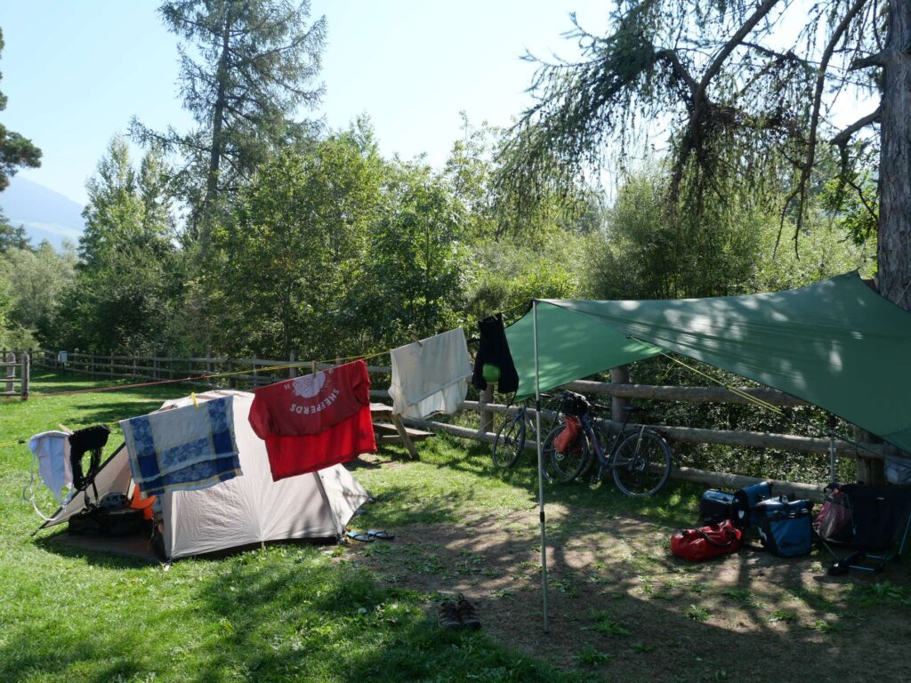 In Prutz am Inntal wollten wir eigentlich Zelten, auf dem Campingplatz bekamen wir den freundlichen Hinweis, dass der folgende Zeltplatz viel besser für Radreisende ausgerüstet sei, also fuhren wir etwa 3 km weiter bis Ried, bekamen noch einen Platz auf einem Stück Rasen vor einem derzeit nicht genutztem Dauercampingzelt.