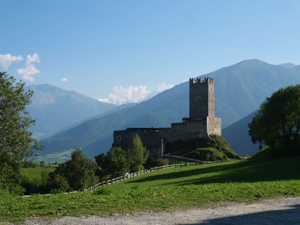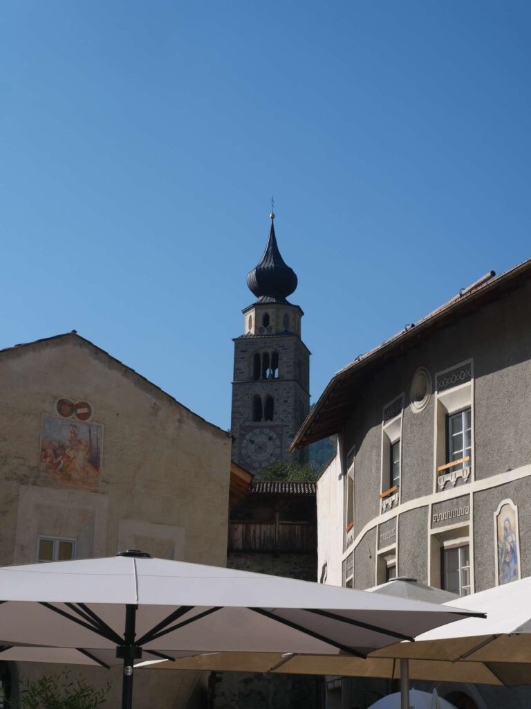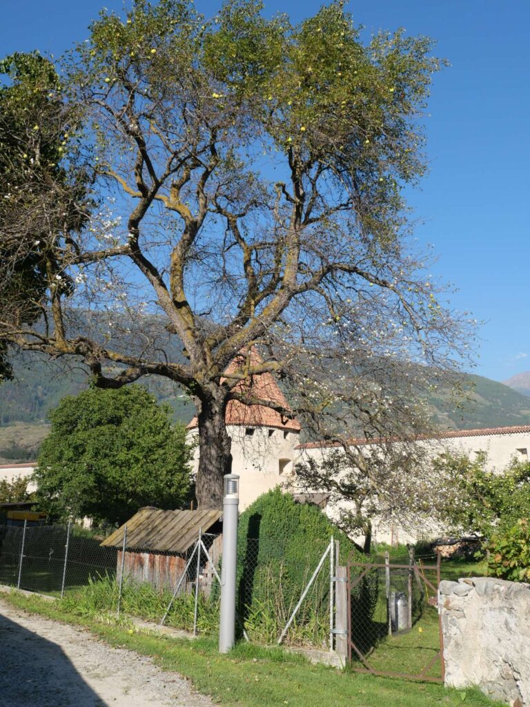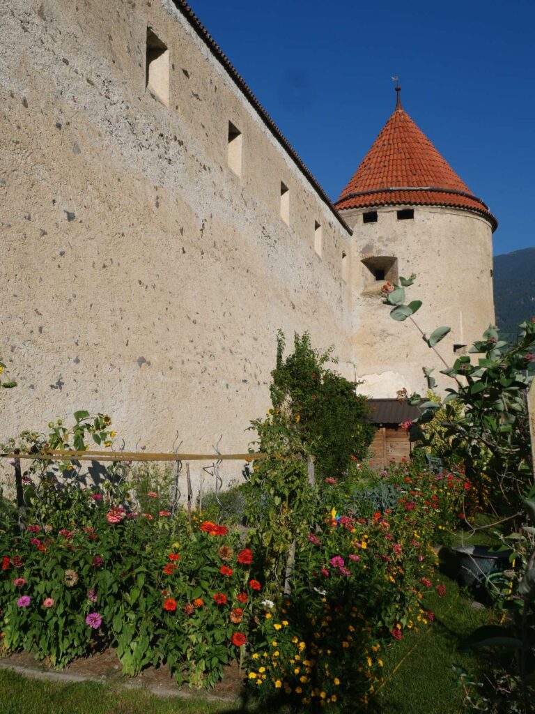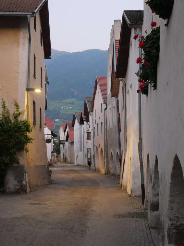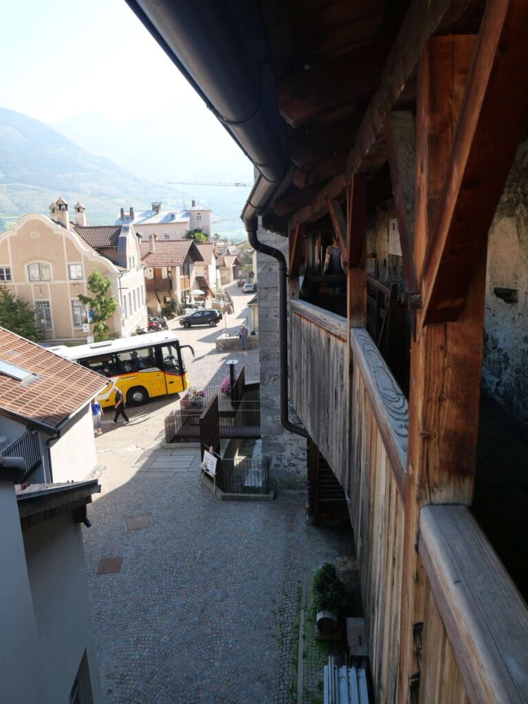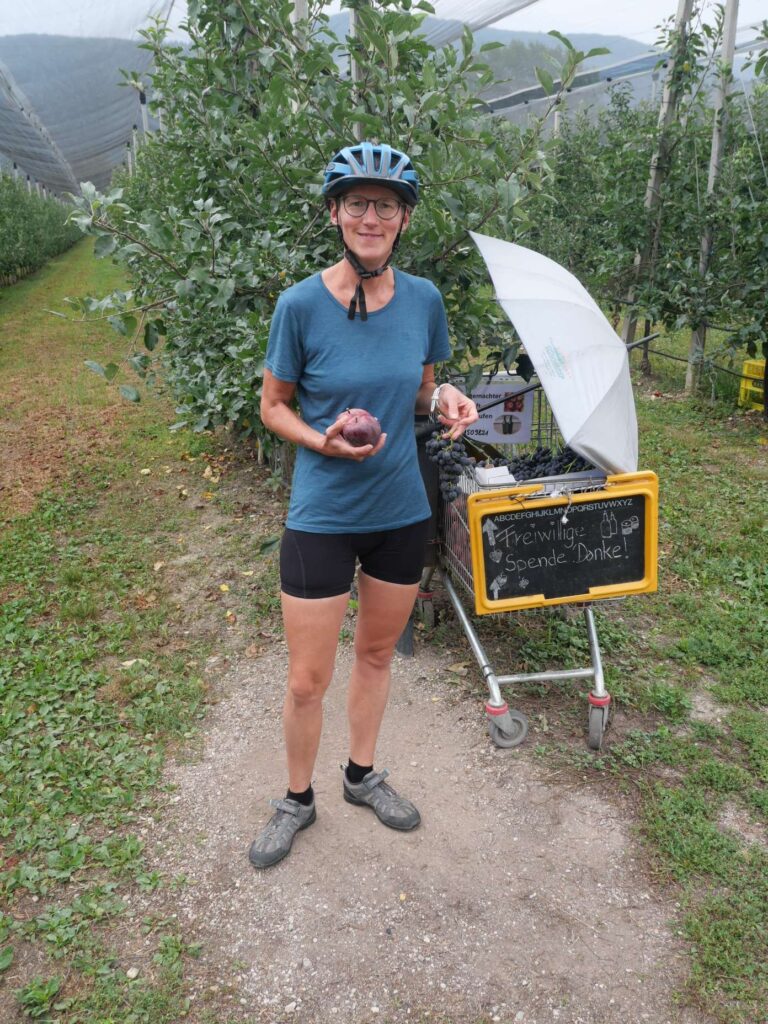 Nun waren unsere Bremsen gefragt und starke Finger. Teilweise gibt es ein Gefälle von 20% und erstmals sehen wir Geschwindigkeitsbegrenzungen für Fahrräder von 30 km/h, die aber auch gerechtfertigt war. Wir rollten bis Glurnz, dort gibt es einen der wenigen kommunalen Campinplätze. Wir bleiben in der kleinsten Stadt Südtirols (so die Eigenwerbung) und beschließen spontan dort sogar zwei Nächte zu bleiben. Am Samstag ist dort das Parabirnenfest mit Markt. Die Parabirne ist eine alte, hochstämmige Variante, die auch Apothekerbirne genannt wird. Wir erleben den Markt, schlemmen Knödel, umwandern die kleine Stadt mit ihrer noch vollständig erhaltenen Stadtmauer und genießen den freien Tag. Nachts wiegt uns das Rauschen der Etsch in den Schlaf.