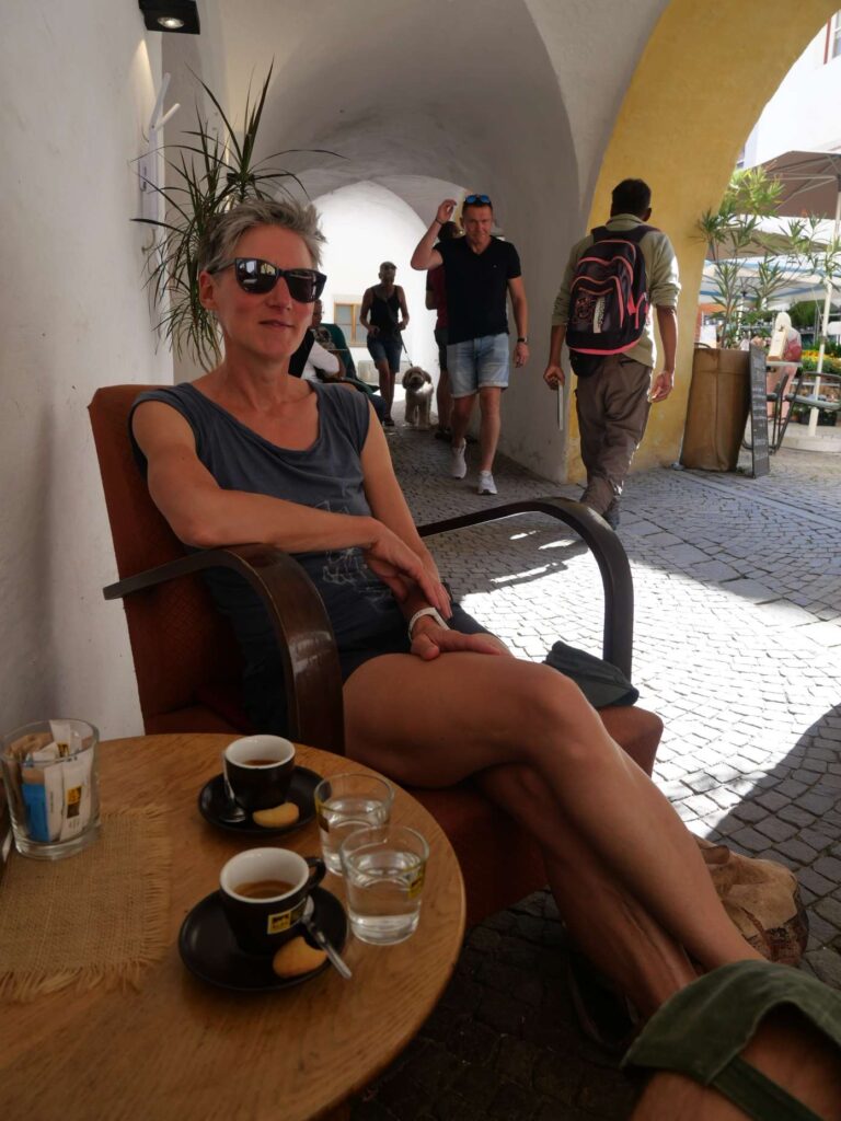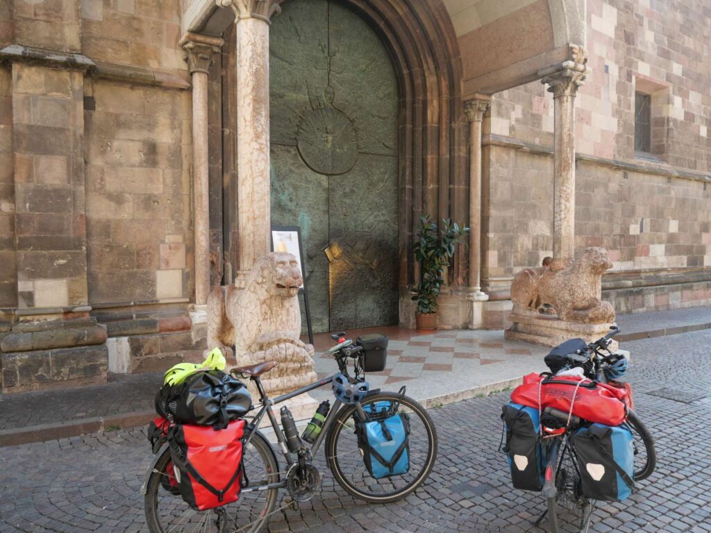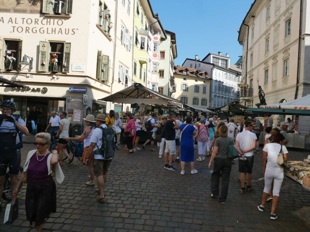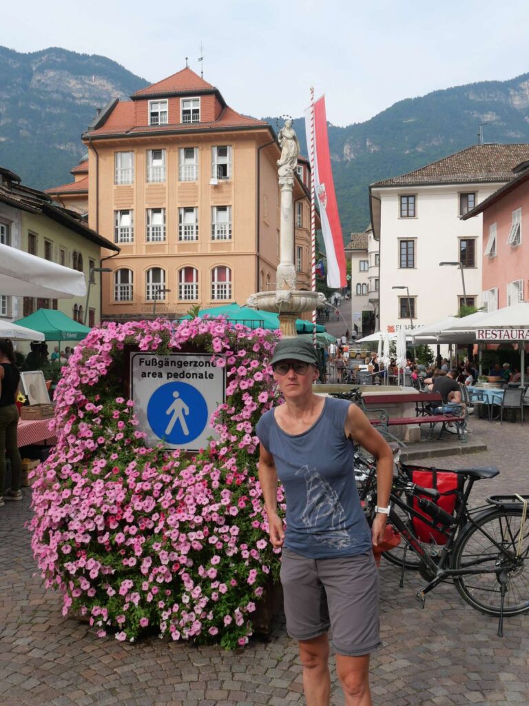 Wir fahren am nächsten Morgen früh los, damit wir schnell in Bozen sind. Ich habe eine Verabredung bei Bike Wellness und Max. Ihn hatte ich vor dem Wochenende angerufen, ob er mir mit meinen Fahrradproblemen helfen kann. Als wir ankommen, liegt schon ein Ersatzritzel bereit, Max wuchtet das Fahrrad voll bepackt (ich hatte angeboten es abzupacken) auf den Reparaturständer. Er stellt fest, dass nicht nur das Ritzel durch ist, auch die Kette ist schon übernutzt und muss getauscht werden. Damit müssen auch alle Ritzel am Hinterrad getauscht werden. Glücklicherweise hat er alle Teile vorrätig. Max macht sich direkt an die Arbeit und schickt uns auf einen Kaffee um die Ecke. Es ist das erste Kaffee, in dem nur italienisch gesprochen wird, wir nähern uns der Sprachgrenze. Nach einem leckeren Kaffee und Cornetto gehen wir zurück zum Fahrradgeschäft. Die Fahrräder stehen schon fertig vor der Tür. Ich bin begeistert, das war eine schnelle, effiziente und freundliche Reperatur. Ich bedanke mich sehr herzlich, zahle und viel früher als erwartet, fahren wir in die Innenstadt von Bozen. In einem Sportgeschäft in den Lauben kaufe ich noch schnell eine neue Gaskartusche. Walther von der Vogelweide als Statue können wir bestaunen sowie einige andere Sehenswürdigkeiten. Dann machen wir uns auf den Weg zum Kalterer See, etwa 30 km hinter Bozen.