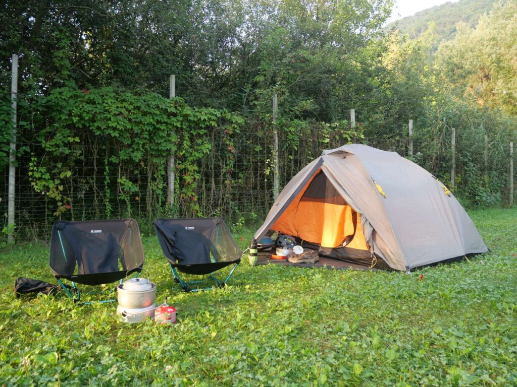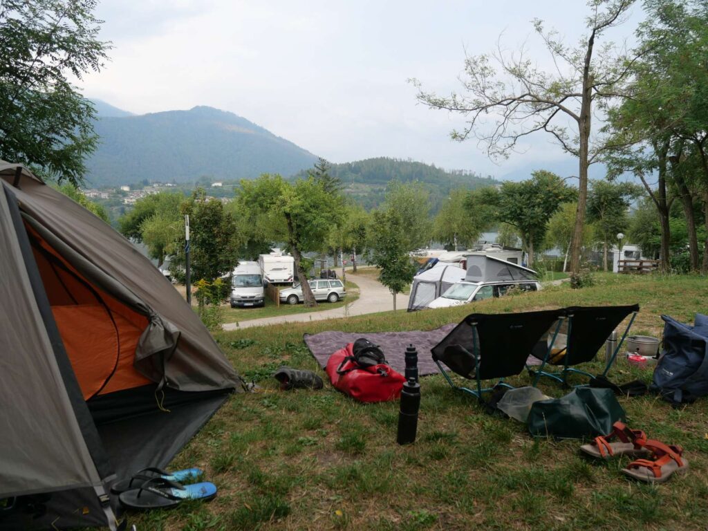 Es wird nun schon früh dunkel, wir sitzen nach dem Abendessen noch vor dem Zelt als uns ein Mitzelter auf englisch anspricht. Er und sein Freund haben eine Gaskartusche gekauft, die aber nicht zu ihrem Kochaufsatz passen. Sie benötigen eine Kartusche mit Schraubgewinde, so wie wir auch. Wir leihen ihnen unsere Kartusche, damit sie sich wenigstens ein Abendessen kochen können und ich erzähle von unserer Erfahrung aus Frankreich, dass man entsprechende Kartuschen auch gut im Baumarkt finden kann. Eine Internetrecherche zeigt, dass es in italienischen Baumärkten auch so sein müsste. Als er später unsere Kartusche zurück bringt, gebe ich meine Rechercheergebisse weiter und wir plaudern noch ein wenig. Er und sein Freund sind Israelis, sie waren gerade auf einem Bierfest in Bozen und wissen noch nicht, was ihre nächste Station sein wird.