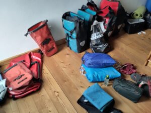 Nun geht es langsam in den Endspurt und all die zusammen gesuchten Dinge müssen in die Packtaschen. Die ursprüngliche Entscheidung möglichst leicht zu reisen wird ständig herausgefordert: soll ich nicht doch noch ein gutes T-Shirt mitnehmen? Sind die Kleider warm genug für Schottland? Brauchen wir noch eine Decke für den Boden? Sollen wir einen dritten… - Fahrräder Fahrtüchtig