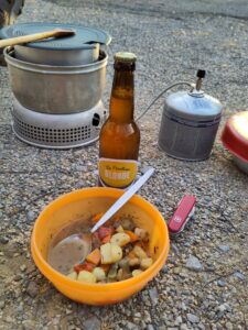 Es ist schon dunkel und immer noch sehr warm. Dennoch sitzen wir in unserem Zelt, draussen grummelt es und immer wieder ist Wetterleuchten zu sehen. Wir beruhigen uns damit, dass wir uns ja notfalls morgen ein Zimmer nehmen können und größere Bäume stehen auch nicht um uns herum, wir können also nur nass werden. Ja… - On the road again